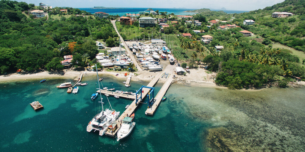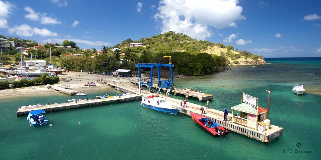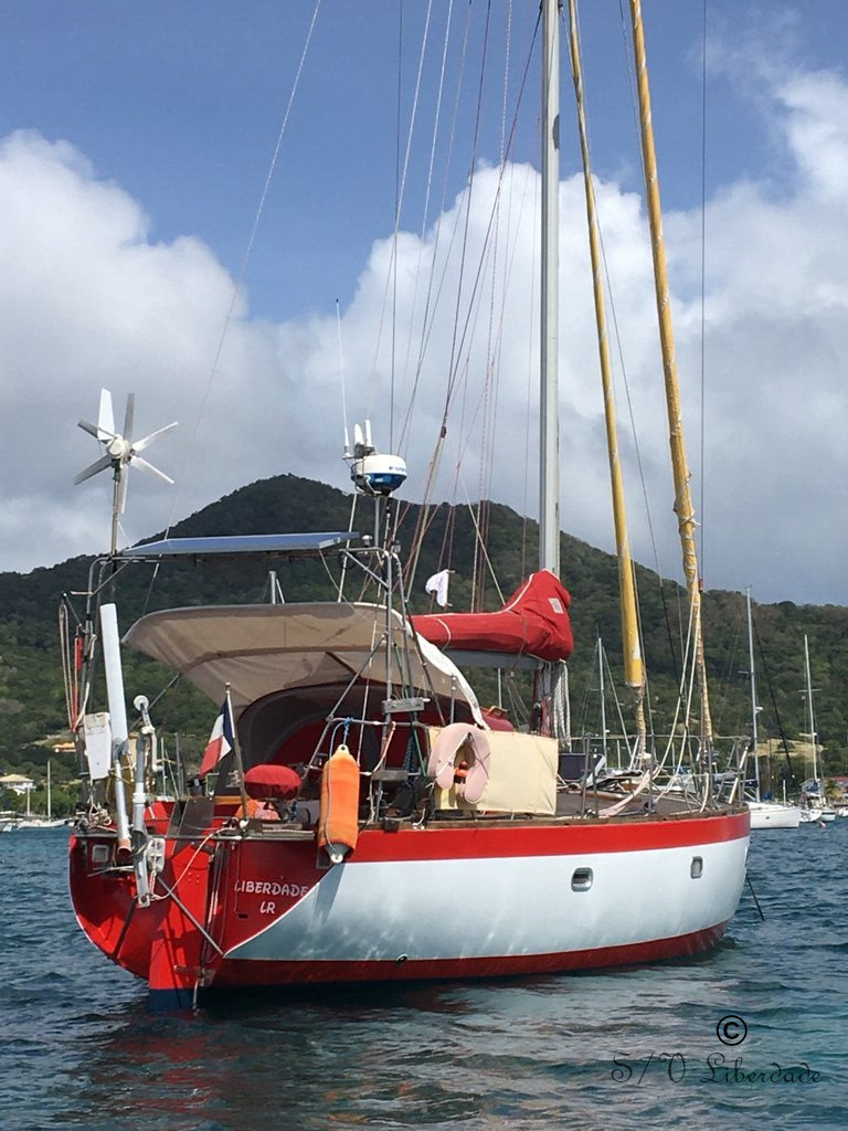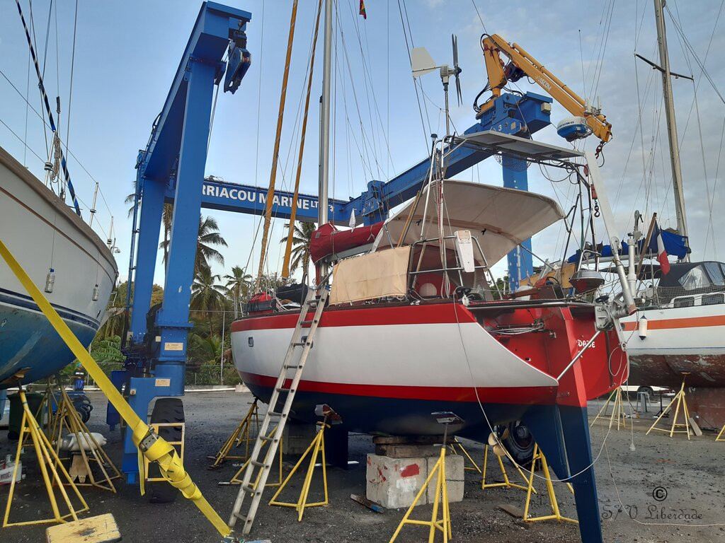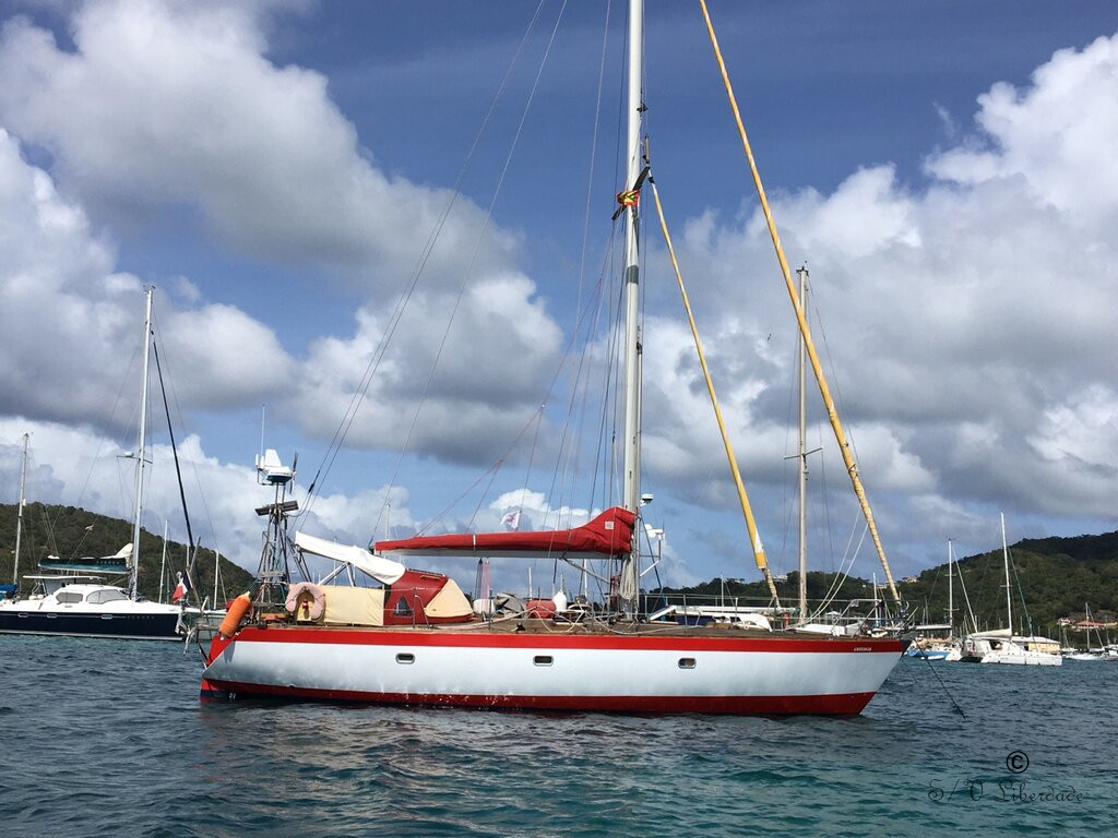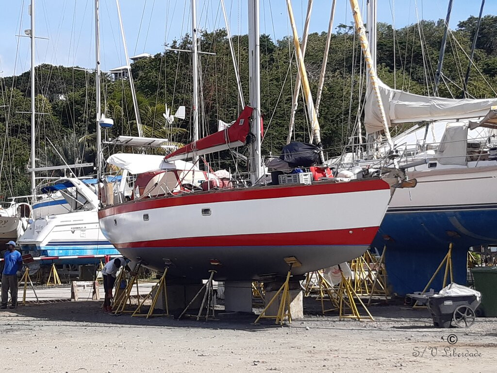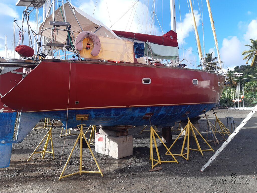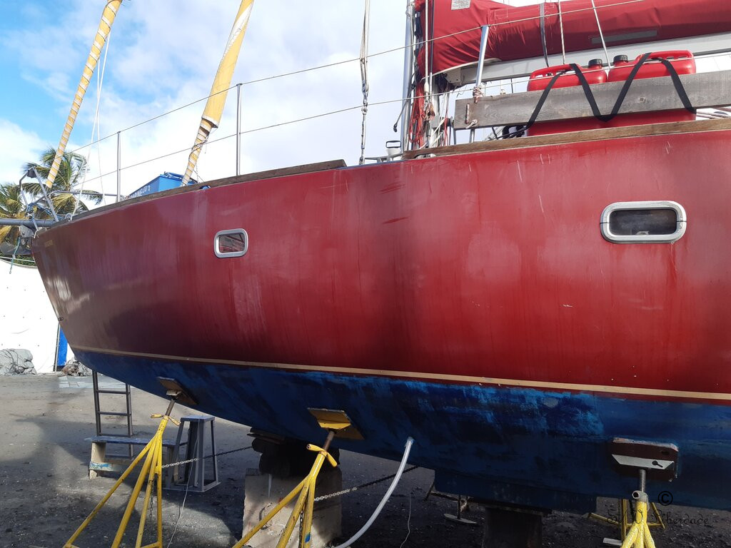 Le séjour Brésilien avait déja révélé une chose, la couleur rouge de la coque qui le rend si atypique provoque une température moyenne DANS le bateau plus que tropicale ! Nous en souffrons la nuit car la température ne baisse pas, le frigo en souffre pour maintenir le frais et la coque elle même en bois déguste. Nous avons donc décidé de procéder à un relooking. Nous profitons de notre présence dans le sud des Antilles pour nous installer sur un petit chantier bien sympathique sur une île juste de la bonne taille : CARRIACOU MARINE