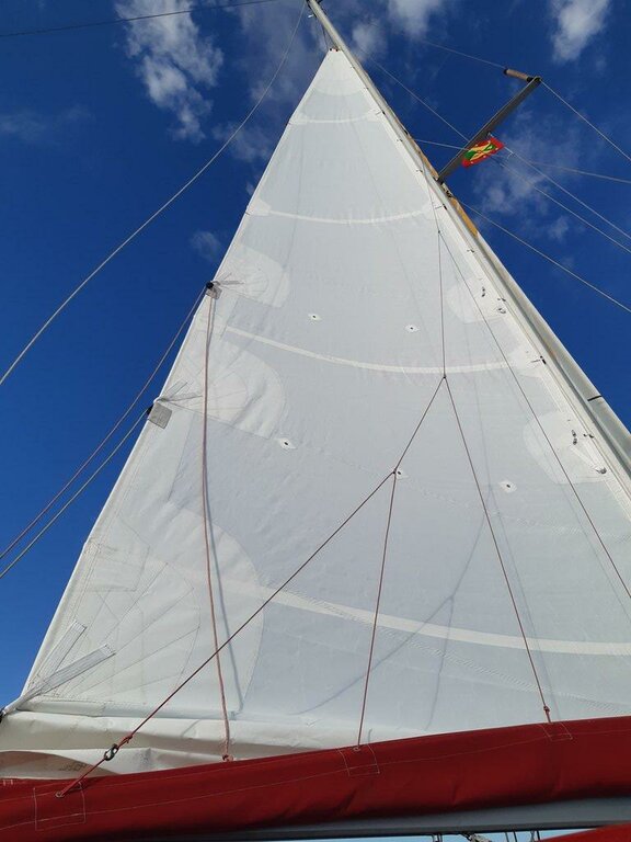 Lors de notre passage sur Grenade, la grande île au Sud, nous avons récupéré notre nouvelle Grand-Voile toute neuve ! Liberdade est pas peu fier et les premiers essais sont encourageants.