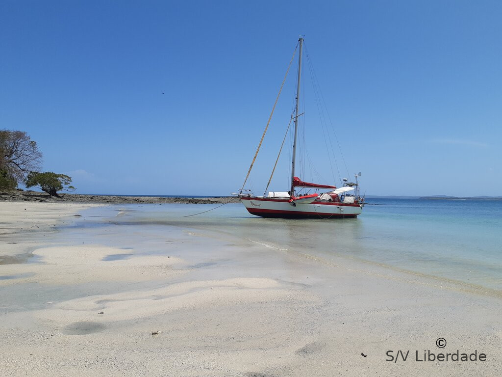 Avec les 4 mètres de marnage (entre marée haute et marée basse) le décor change souvent. Nous profitons du fait que la quille de Liberdade se remonte pour "beacher" sur le sable à marée basse.