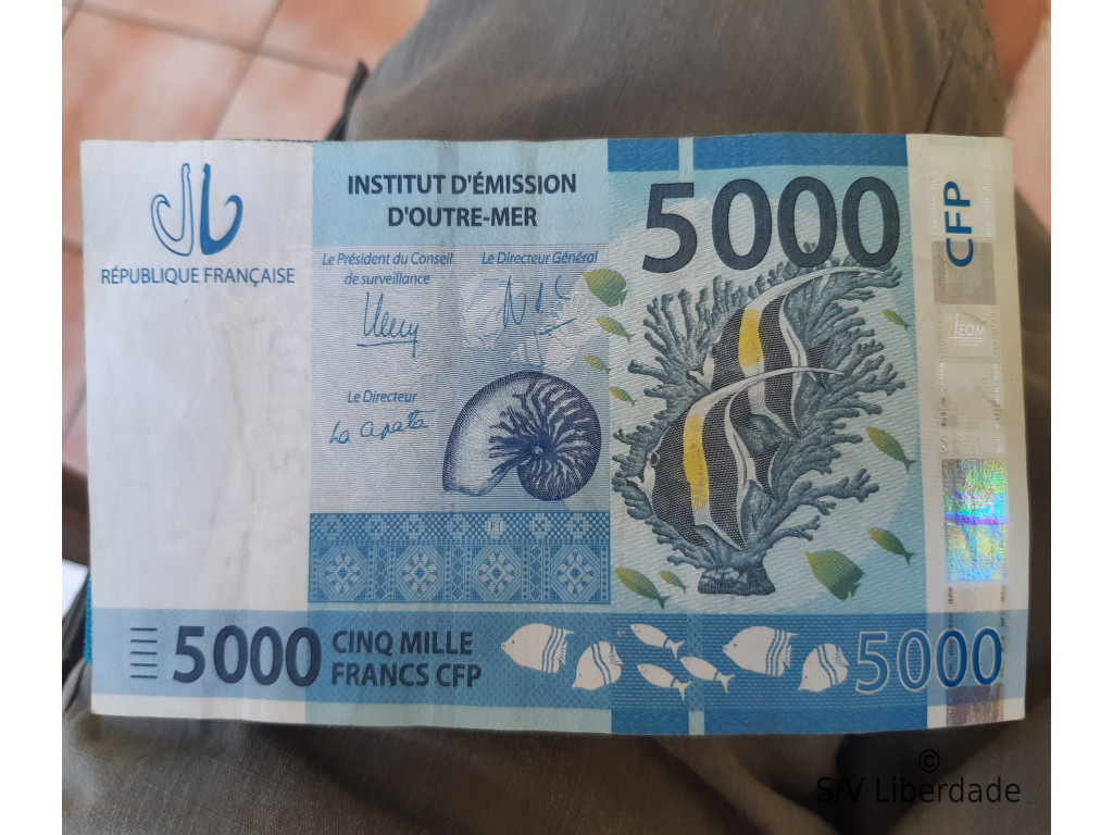 Les formalités sont vite expédiées grâce à la bonne humeur de la dizaine de gendarmes en poste et notre nationalité ;-) Mais bon y a quand même une petite taxe a payer ! Cela ne sera pas sans mal car le seul distributeur (neuf) de billets à la poste est en panne depuis de nombreux mois. Il sera... bientôt réparé ! Nous arrivons néanmoins à troquer quelques devises en échange de beaux billets ! Et oui c'est la France mais pas l'Euro.