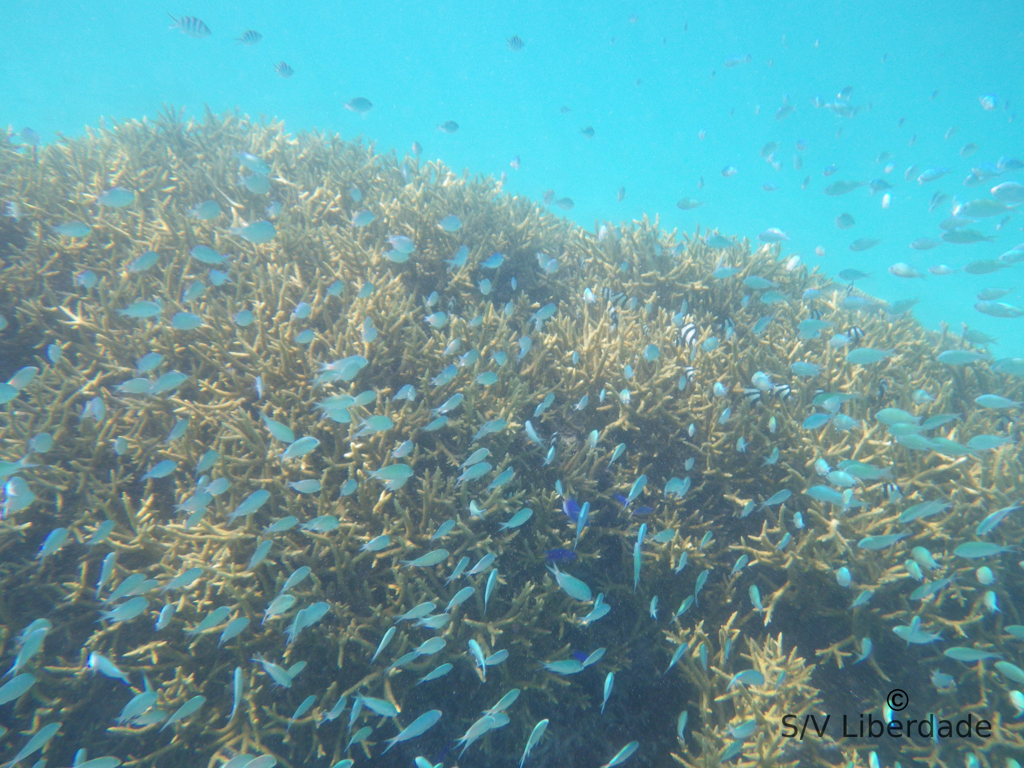 Nous découvrons la navigation au milieu des "patates" de corail. Pas simple de jeter l'ancre sans tout ravager mais il y a une technique. Le plus dur étant de trouver la place qui va bien au milieu de ces plots de corail affleurants.