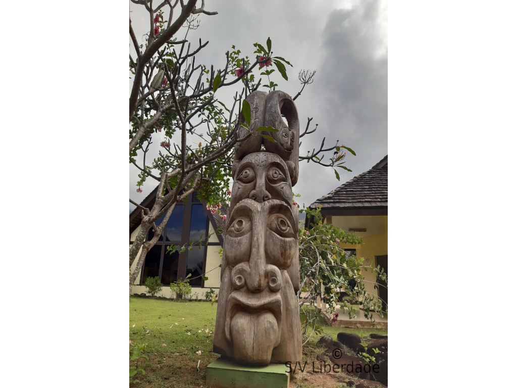 Le site archéologique de Utukua lui, dans la vallée de Punaei, abrite le "tiki souriant" en pleine forêt tropicale, sur un ancien espace de fête Tohua et d’un me’ae (marae). C’est l’un des rares tikis connus en Polynésie avec cette expression. (On y a pas vue de banian) Haut de moins d'un métre, il sort difficilement de la végétation avec les arbres gigantesques autours. Sa tête qui se bidonne avec ses grandes lunettes semble couverte d’un bonnet. Les mains sont placées sur le ventre de chaque côté d’un nombril bien visible. Cool quoi !