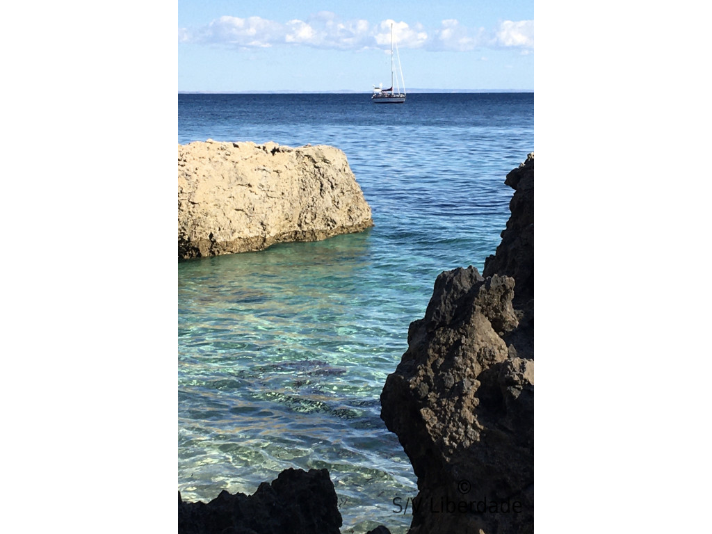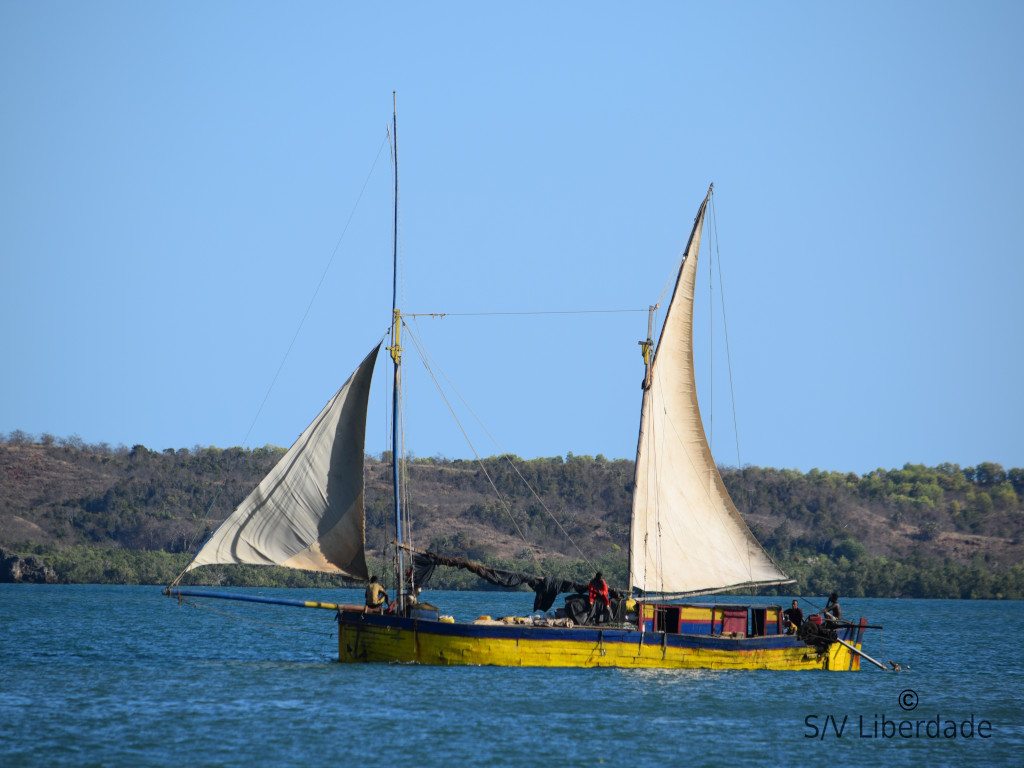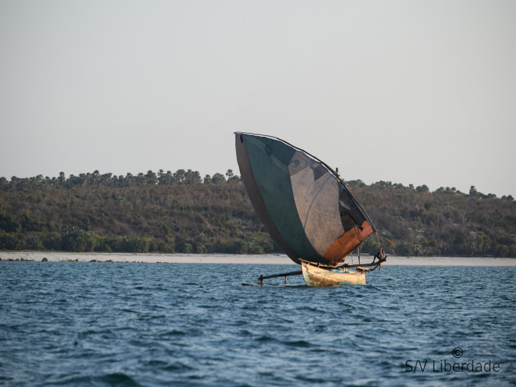 Un jour alors que Liberdade file 7,5 nds vent 25 nds travers, un insolent solo sur sa grande pirogue à voile nous double à plus de 10 nds. La barre dans une main et l'écope dans l'autre.