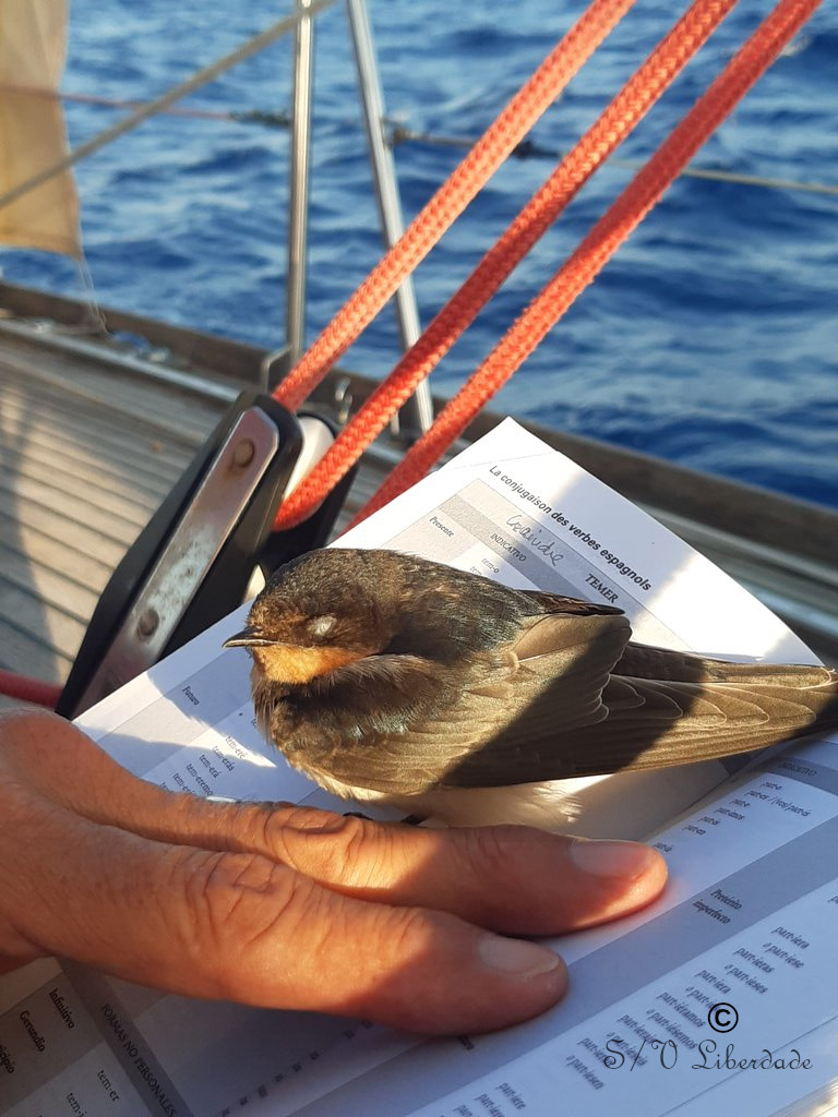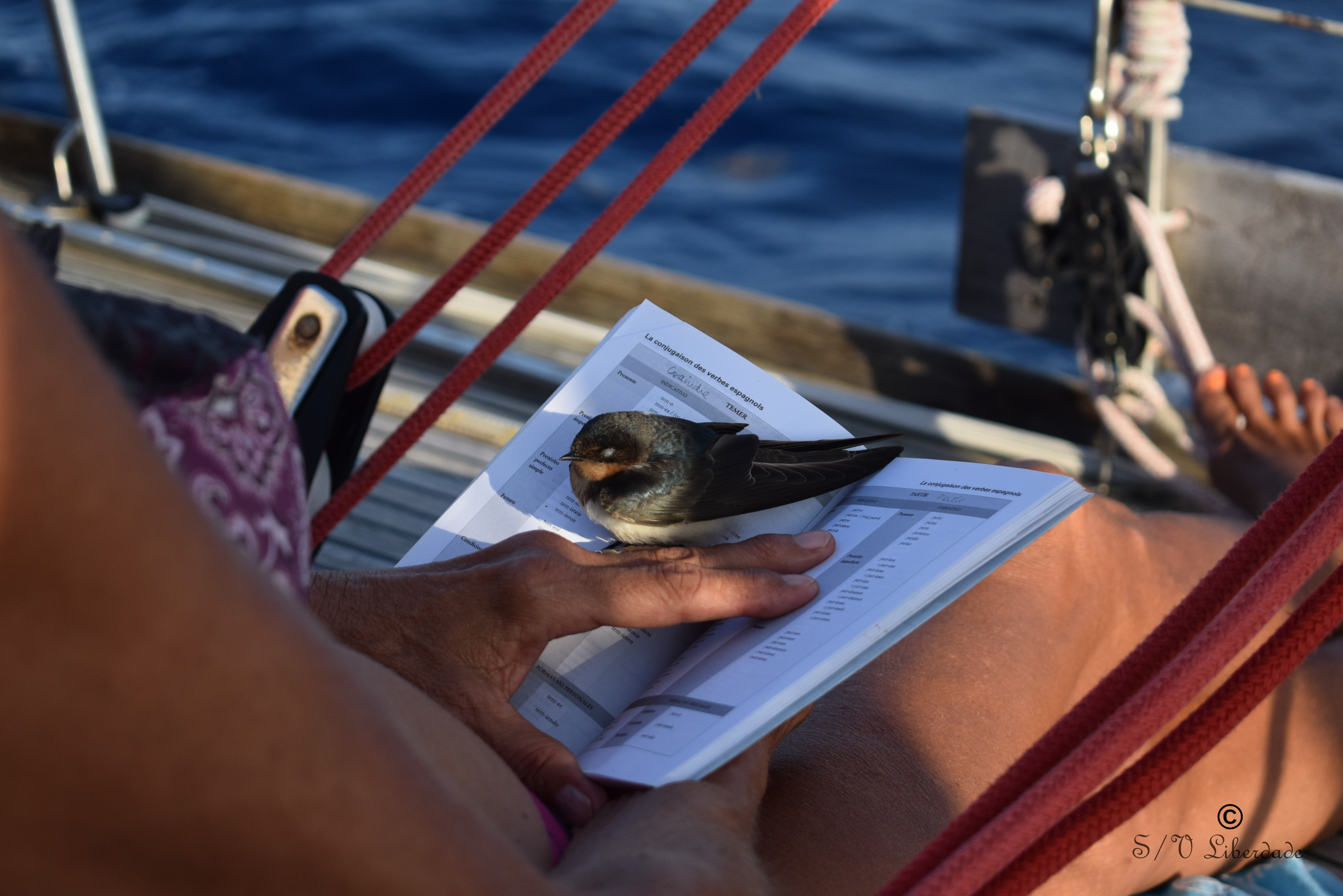 Nous aurons aussi la compagnie des petites hirondelles (à plus de 100 Milles des terres) qui viennent certains soirs faire une pause. L'une d'elles, voyant que Véro peine avec la révision des verbes irréguliers espagnols, viendra lui prêter plume forte.