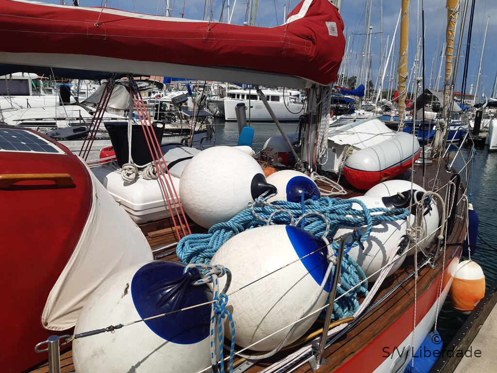 Fini la City, 2022 est là. Place au PACIFIQUE!!    40 ans de navigation Atlantique, Manche, Mer du Nord, Méditerranée, il était temps ! L'équipement réglementaire est arrivé a bord. Liberdade se prend déjà pour un paquebot transocéanique ! La taille des "pare-battages" ( les boules blanches) et des amarres (bleues) nous laisse présager du pire .