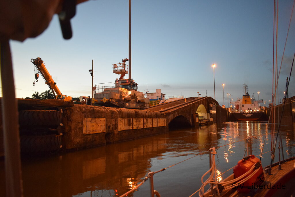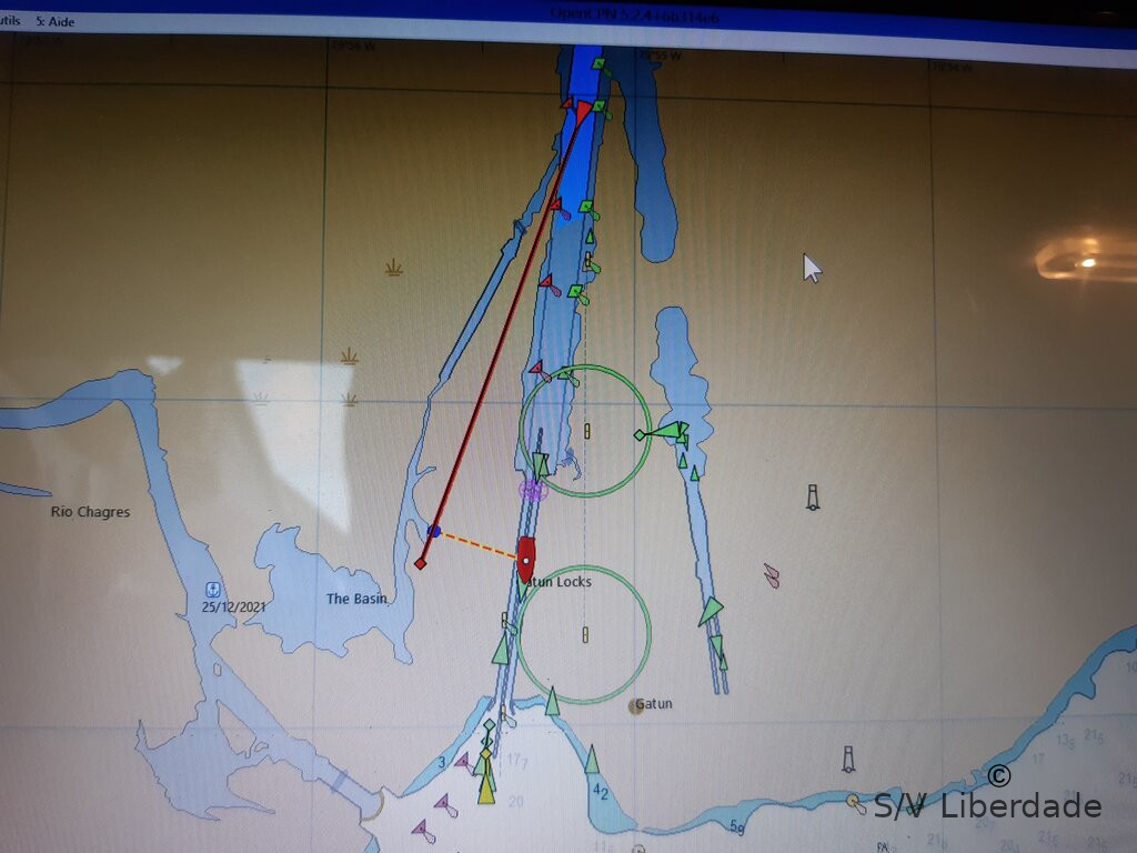 6h50, on est au milieu du premier jeu de portes, le "Gatun Locks". Bientôt le lac du même nom (Gatun) s'ouvrira à nous. C'est le trait d'union avec l'autre monde. Les observateurs verrons sur la carto notre mouillage du 25/12 sur le Rio Sagres, un peu sur la gauche wink, avec le bassin au crocodile !