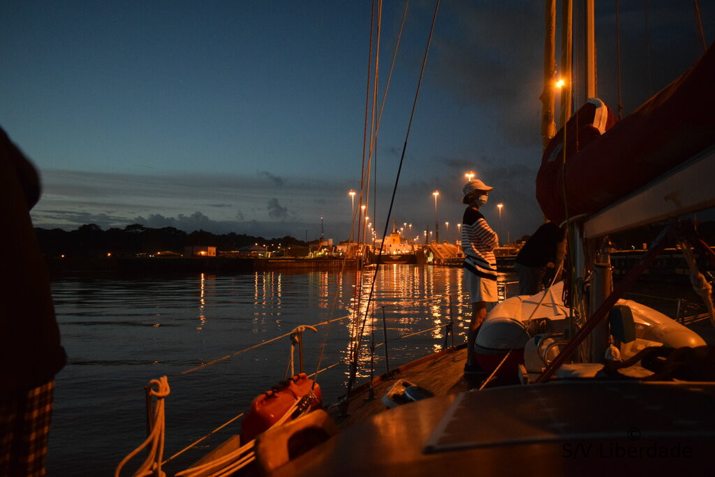 Le RDV est confirmé (avec 2 jours de retard) pour 3h30 AM dans un coin de la rade ou le pilote officiel $$ doit nous rejoindre. C'est donc avec les yeux qui piquent que nous quittons la marina. Le canal fonctionne 24h/24, mais les coquilles comme nous ne sommes pas autorisé a transiter de nuit, on pourrait nous écraser...