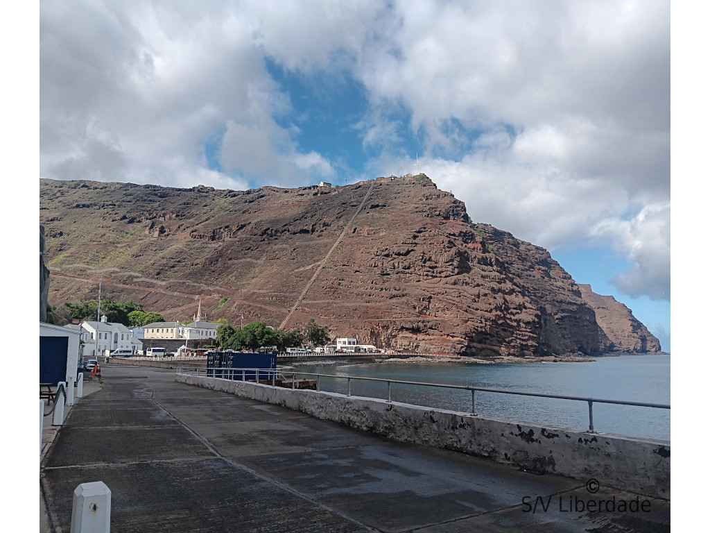 9h - Mouillage dans la baie de Jameston ( très rouleur). Impossible d'utiliser l'annexe pour débarquer en raison du ressac sur le quai. Nous sommes au pied d'une impressionnante falaise et le balai des Paille-en-queue sera un régal au coucher du soleil.