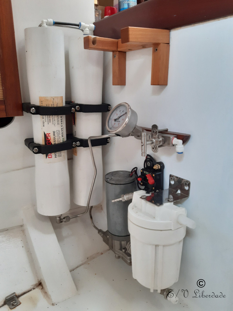 Un dessalinisateur d'occasion vient compléter notre équipement et nous assurer l'autonomie en eau potable. Son installation dans la SDB sera un long chantier car il faut appréhender son fonctionnement, ses exigences en débit d'eau de mer dans toutes les positions du bateau, ses besoins en puissance électrique... Mais le résultat est là : 5 GPH soit env 20 L/heure d'eau douce. En le faisant tourner 2h tout les deux jours, on couvre nos besoins ! Si le principe est ultra simple, c'est une véritable "usine a gaz" qui fait de l'eau !