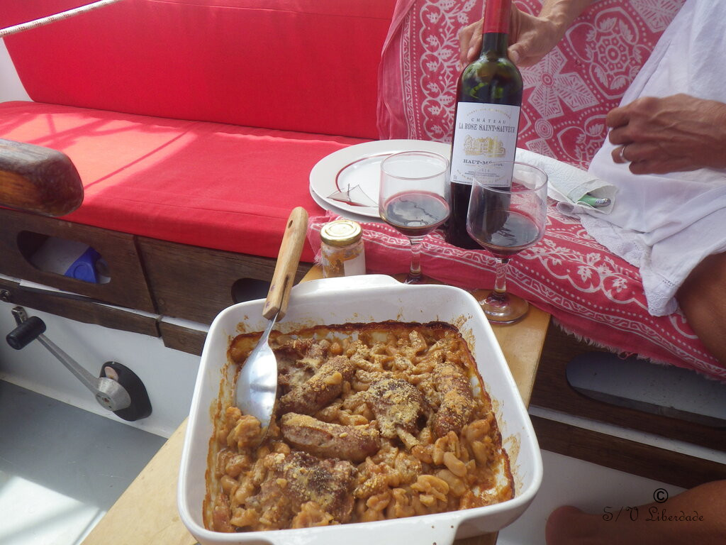 Le 14, 22h30 passage de l'équateur S->N. Un bon cassoulet gratiné avec son verre de Haut-Médoc pour fêter ça. Chacun remarquera l'importance de la nourriture en navigation ! (Avant et après aussi)