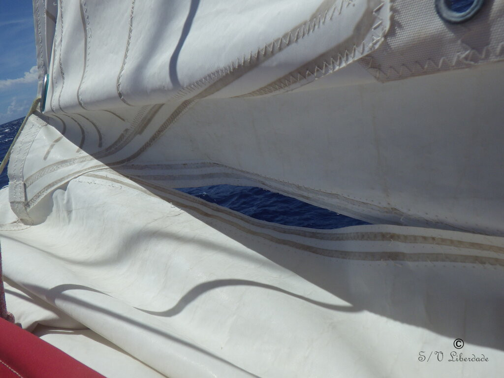 Ce sera sûrement le dernier voyage de notre grand-voile. Elle nous lâche de partout, le fil des coutures est grillé par les dizaines d'années et un excès de soleil tropical.