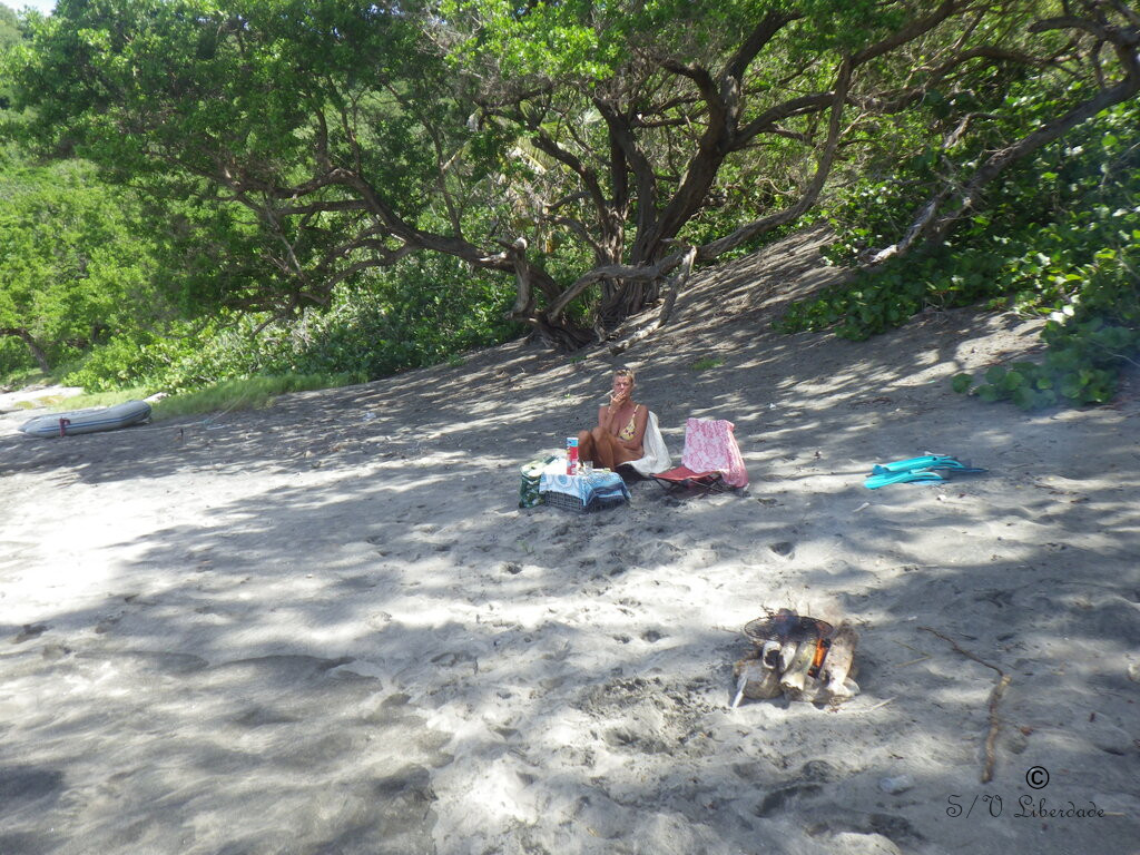 Un petit BBQ improvisé sur la plage déserte pour fêter notre voyage - BONHEUR... enfin à part les moustiques ! Comme diraient certains, la nature est hostile ! Le zodiac en profitera pour se laisser aller et se dégonfler ; son remplacement devient une urgence. Toutes ses "coutures" lachent elles aussi.